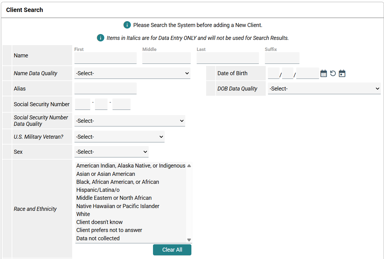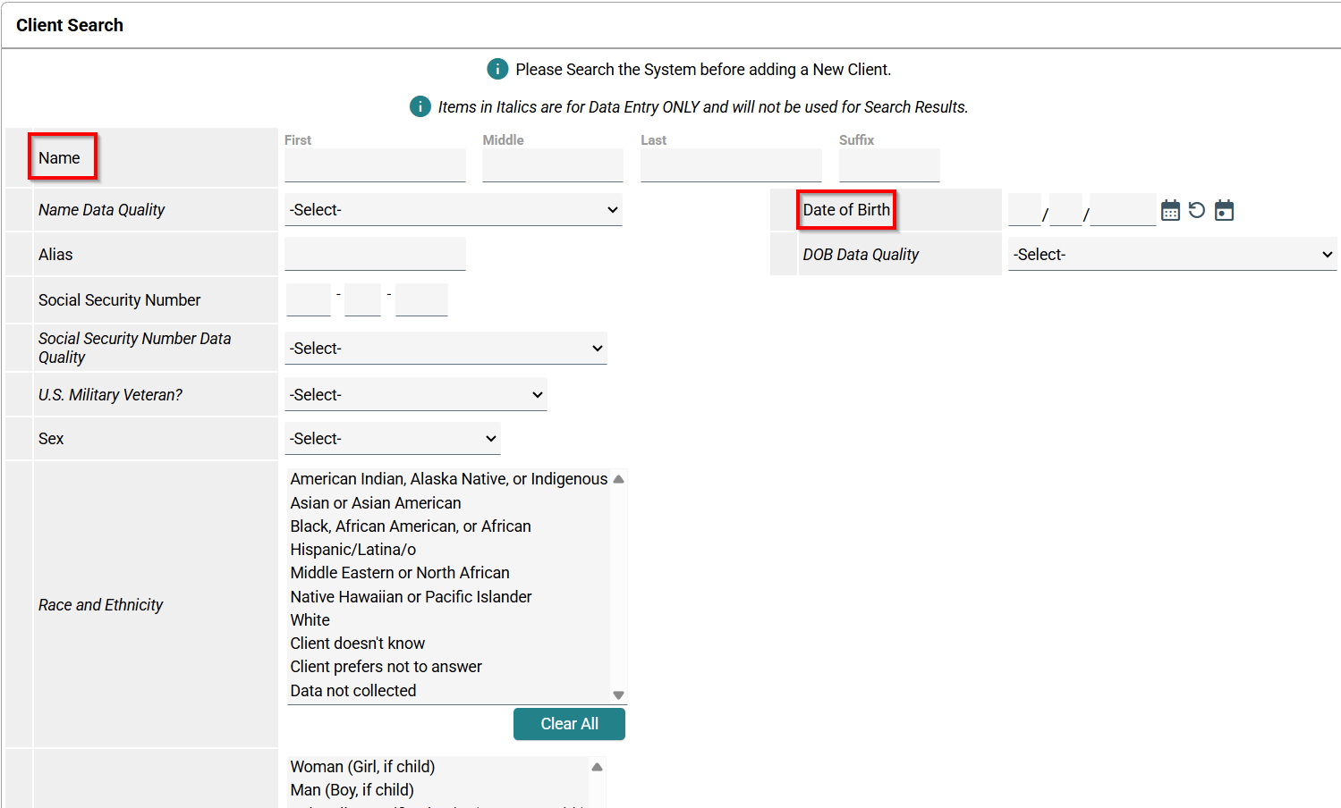 - You can search by any of the fields that are not italicized. Use the client's Date of Birth or SSN if you have it