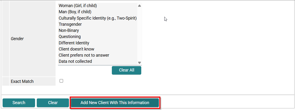 If the client is not found in any of these searches, you can create a new client. Please be sure to fill out the rest of the fields in this section including the Data Quality questions before clicking Add New Client With This Information.