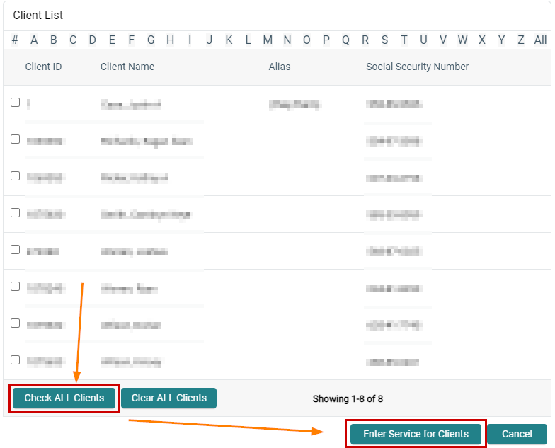 Click on the icon and search by Client Name or Client ID. If you cannot find the Client, then they are not enrolled in OASIS yet. Stop this process - do not add a new client in this workflow! Use the ClientPoint Workflow to create the client and enroll them in OASIS. Then you can return to this process.