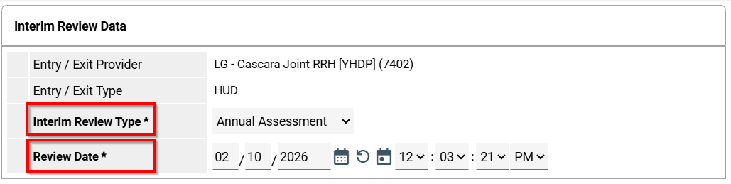 Annual assessments are entered by recording an Interim Review for the client. An Interim is due on the anniversary date of the project enrollment. If the client is enrolled in both TH and RRH, an assessment needs to be recorded for each project on the anniversary of that project's enrollment. Remember that for annual reviews, your review date should be the same date as the anniversary date, even if it is a slightly different date than when you collected the information.